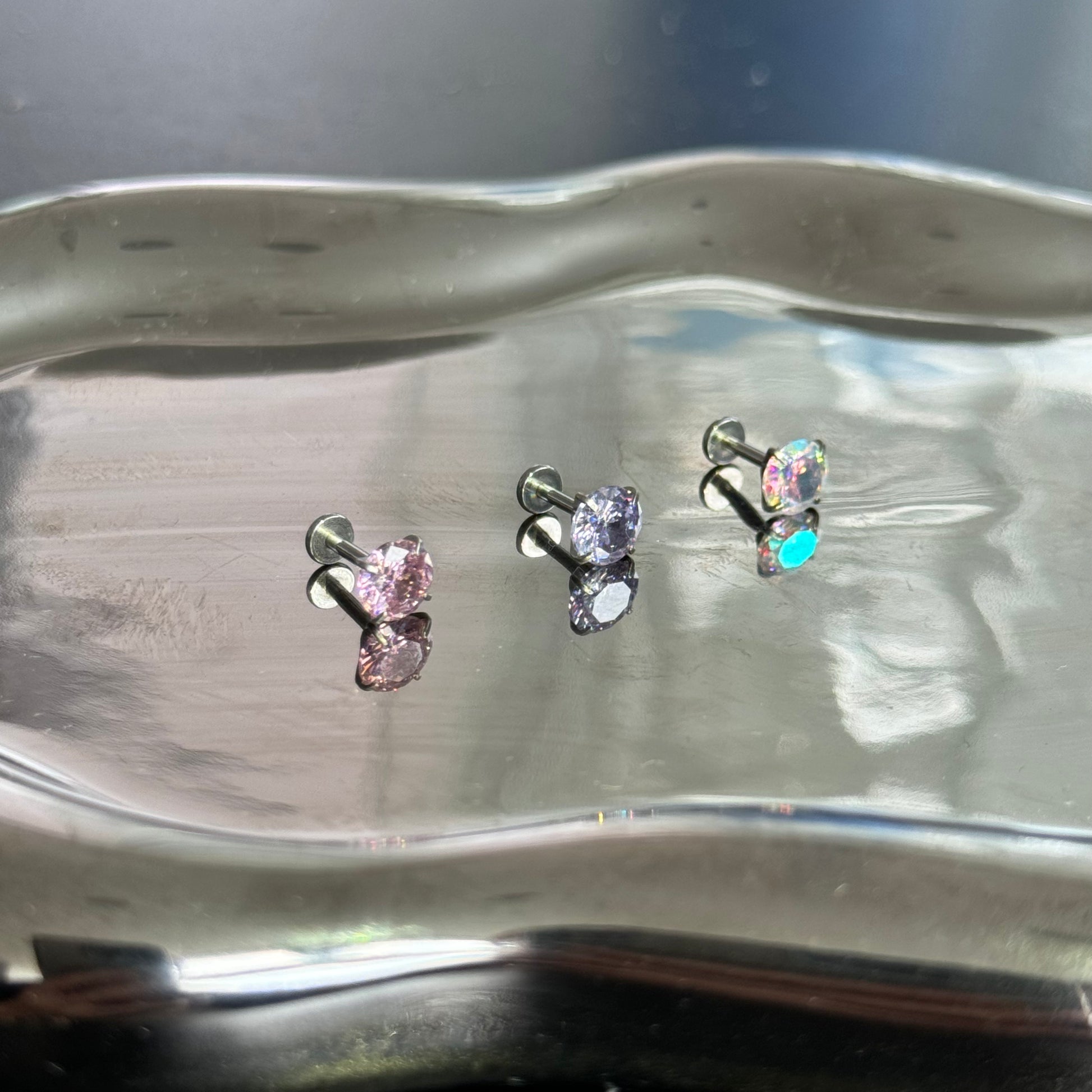 6mm Colorful Crystal Helix Earring • Pink/Purple/White • Silver/Titanium Steel • 0.8mm Ultra-Thin Post • Internally Threaded Flat Back