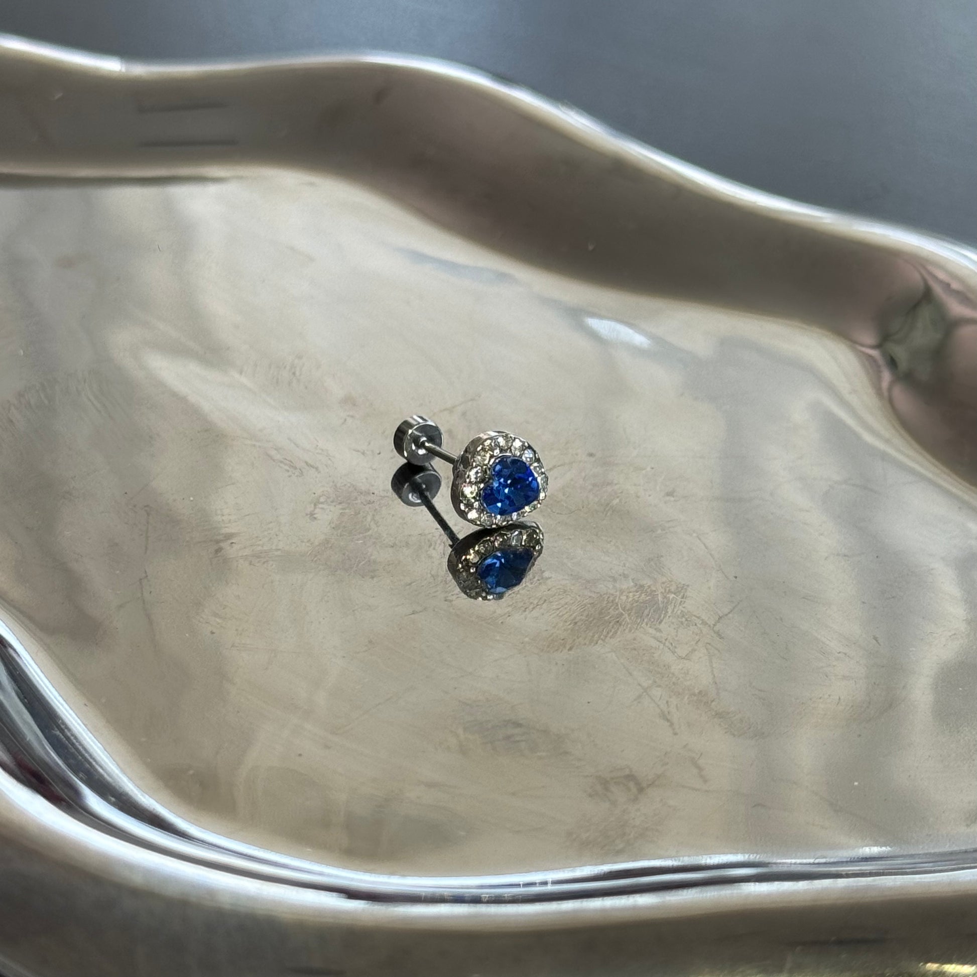 Blue Heart Love Full Diamond outer side round Helix Earring Single silver/titanium steel flat back stud outer threaded