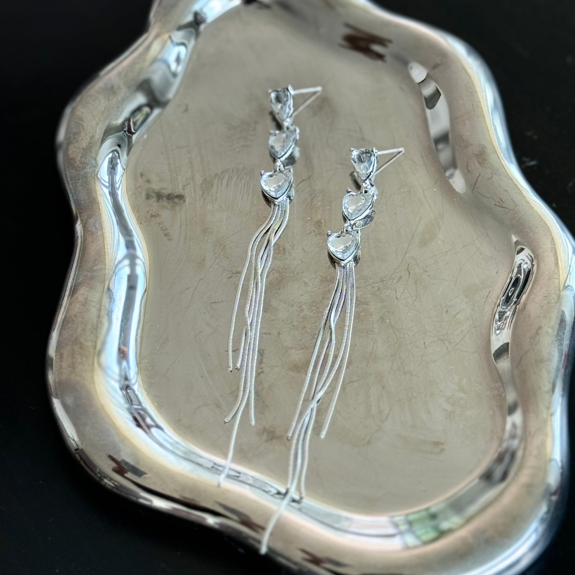Layer your light, unleash your love. These earrings reimagine romance as kinetic art—a diamond-crusted heart pendant anchored above a cascade of liquid silver tassels. Crafted in solid S925 silver, each piece merges symbolic depth with bohemian fluidity, designed to stack, sway, and tell your story in light. For the curator of soulful contrasts.