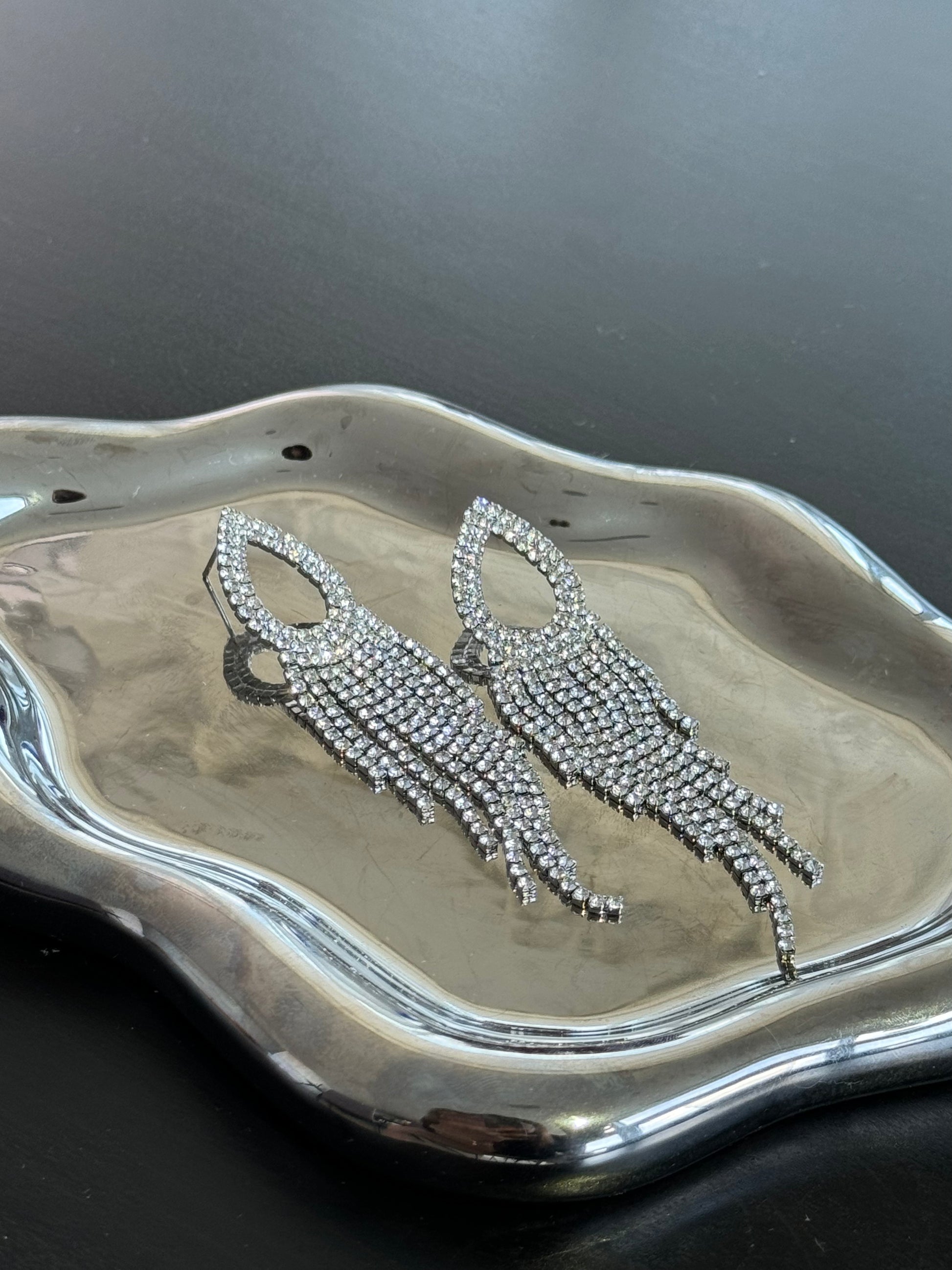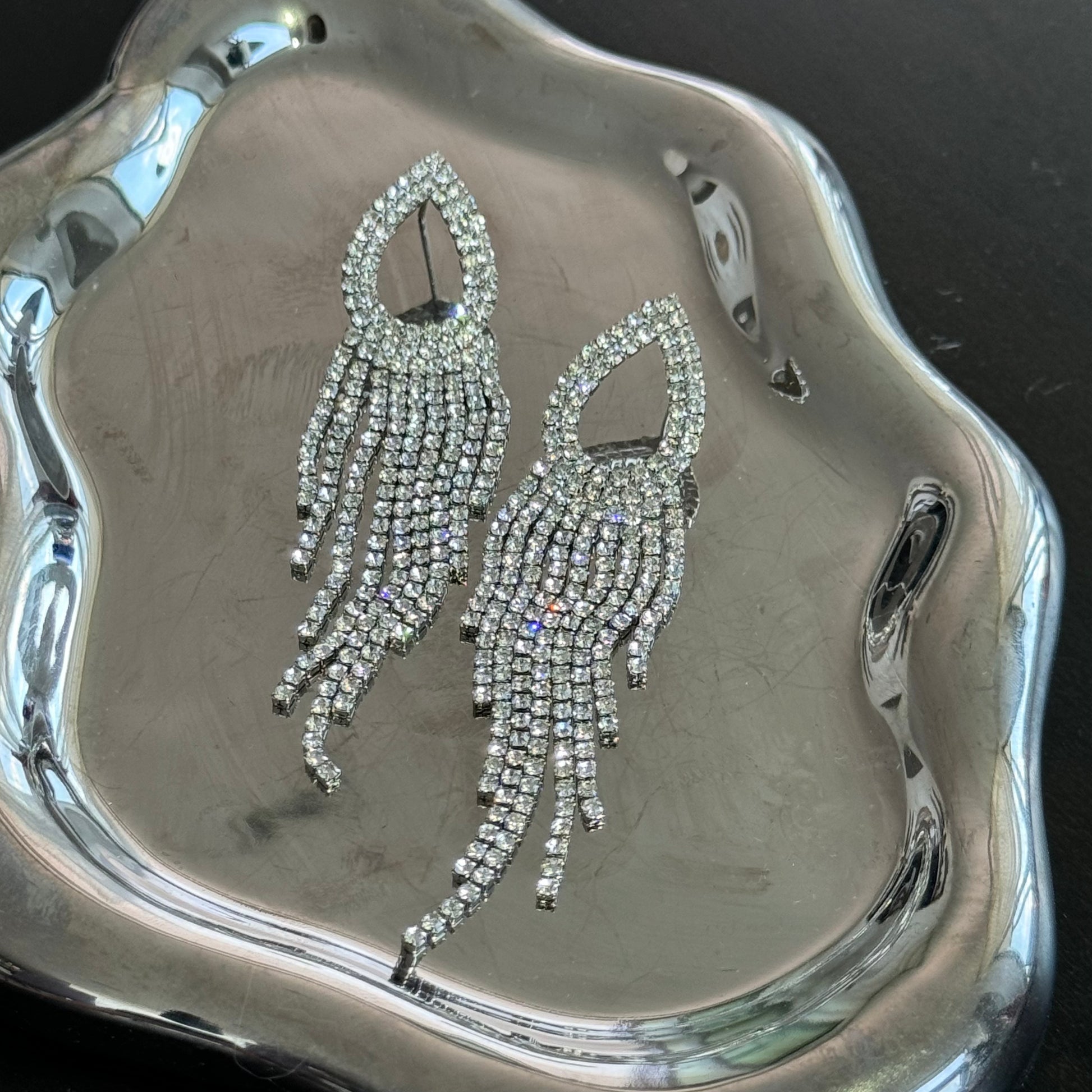 Where geometry melts into motion. These earrings command attention with a wide, diamond-encrusted disc suspended above a waterfall of delicate silver chains. Crafted in solid S925 sterling silver, the piece merges structural opulence with kinetic fluidity—a wearable paradox of bold brilliance and hypnotic movement. For the modern alchemist who transforms light into legacy.