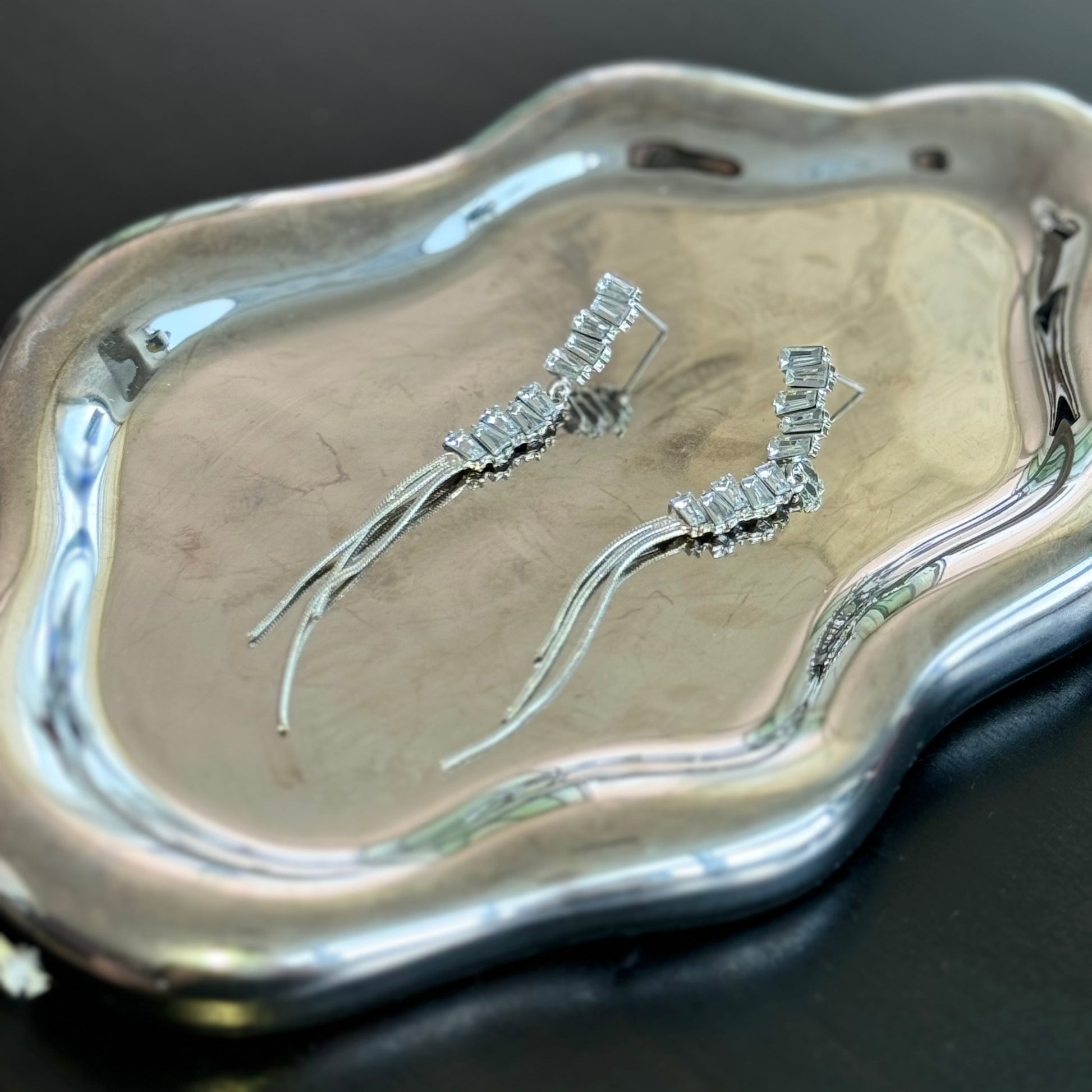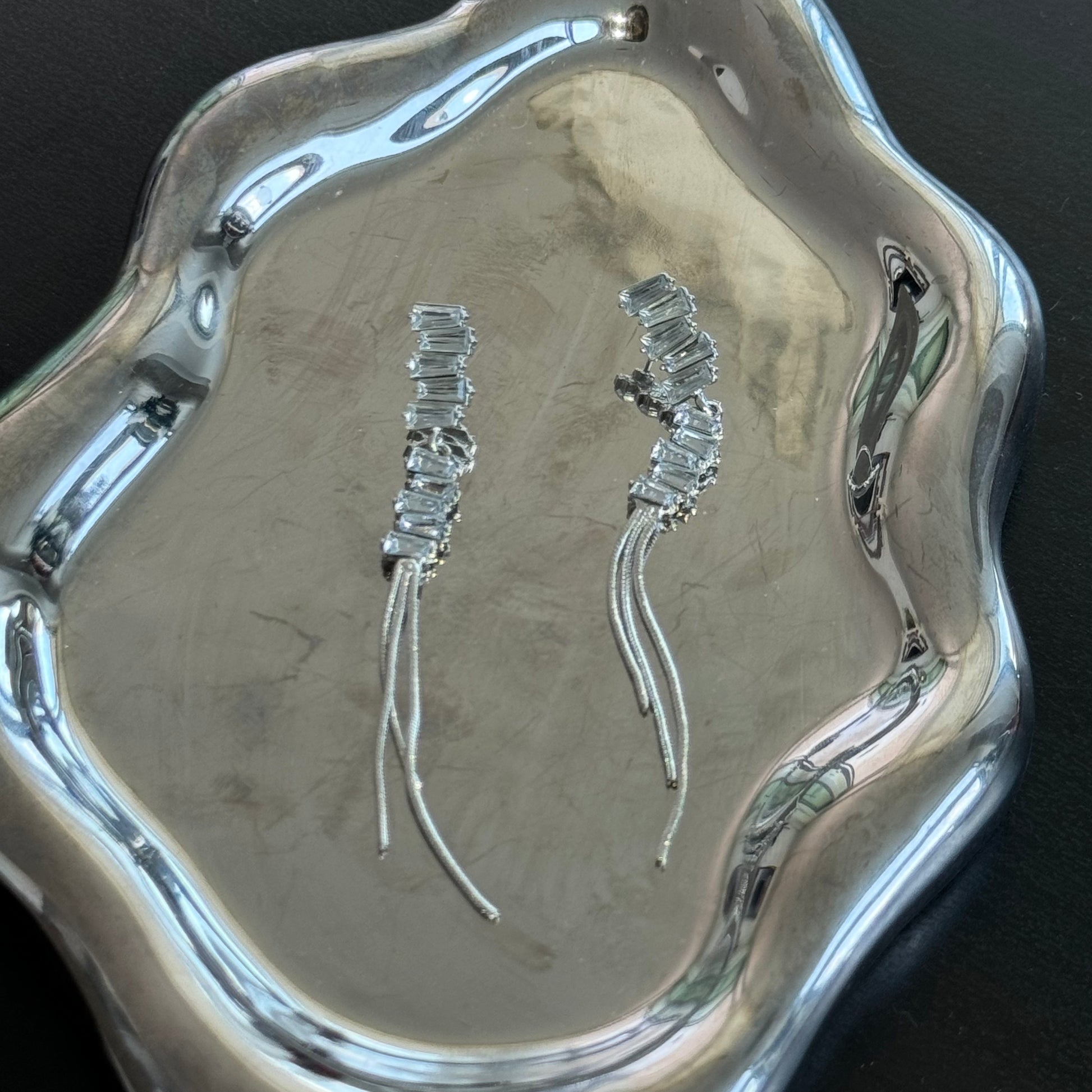 Rectangular Stacked Diamond Drop Tassel Silver Earrings